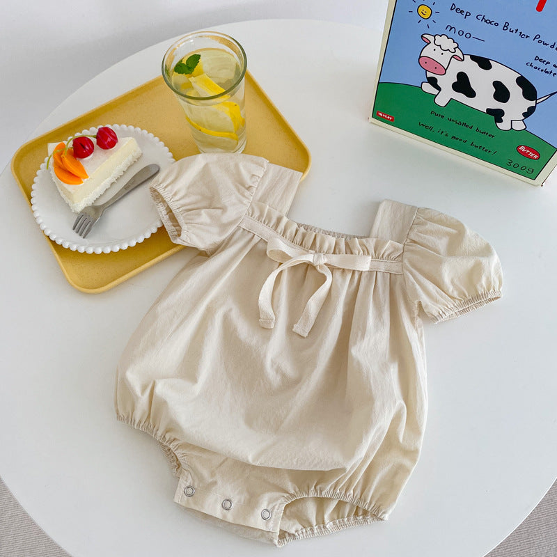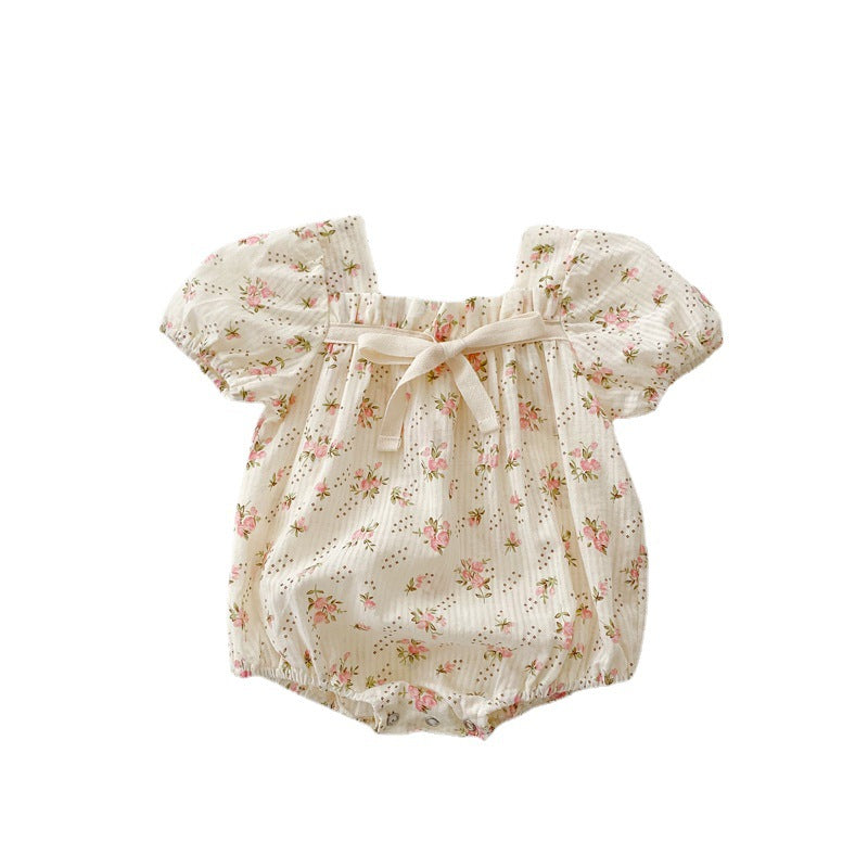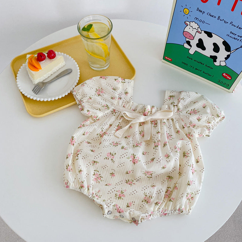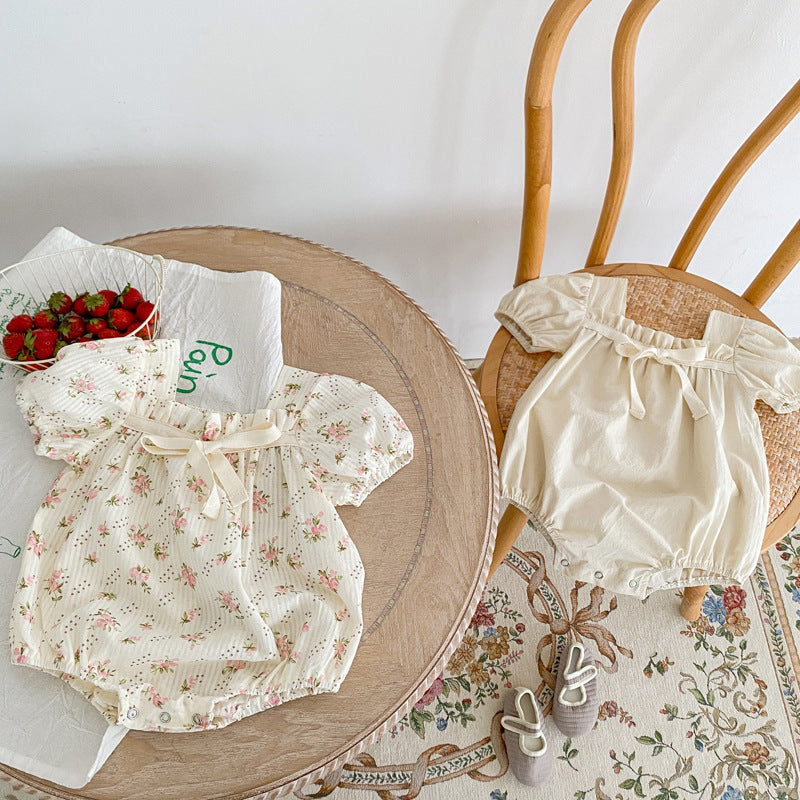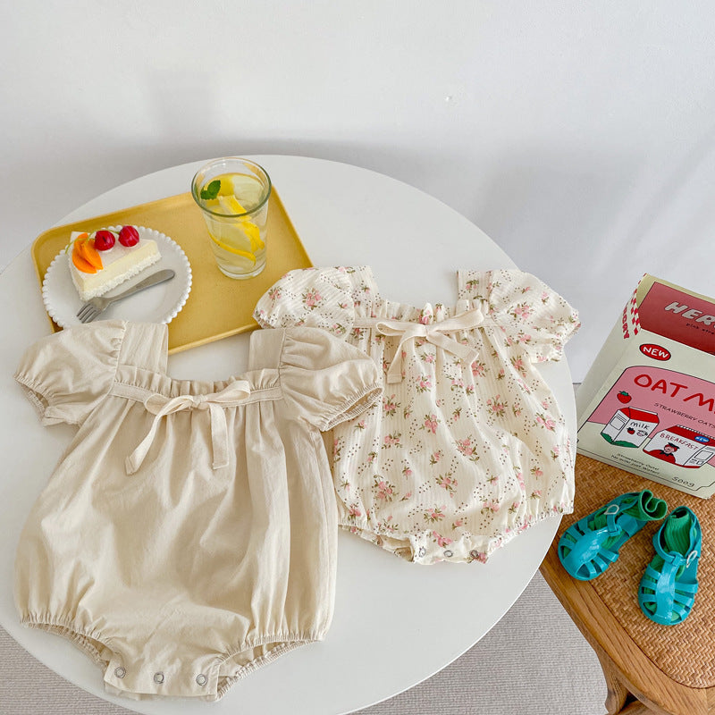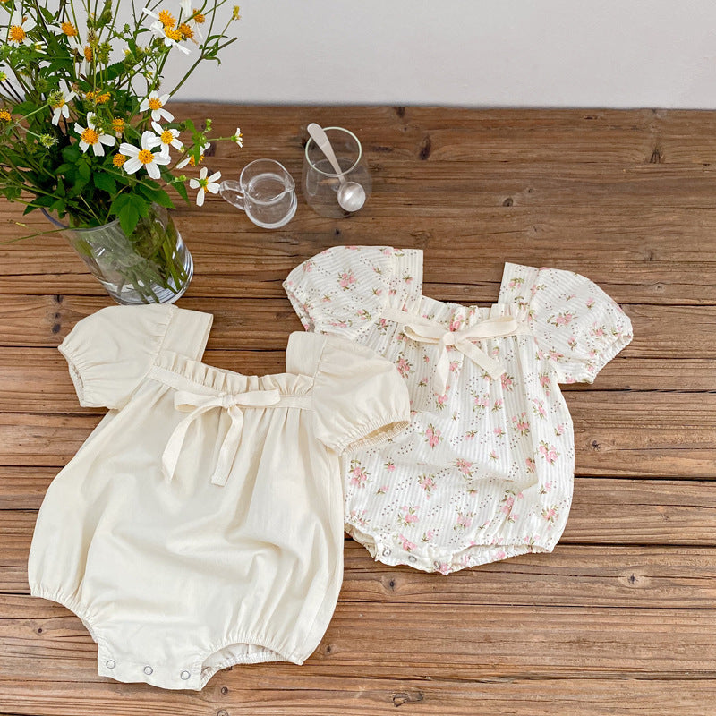 Summer Baby Onesie With Small Floral Bow Solid Color Baby Girl Puff Sleeve Bag Fart Romper