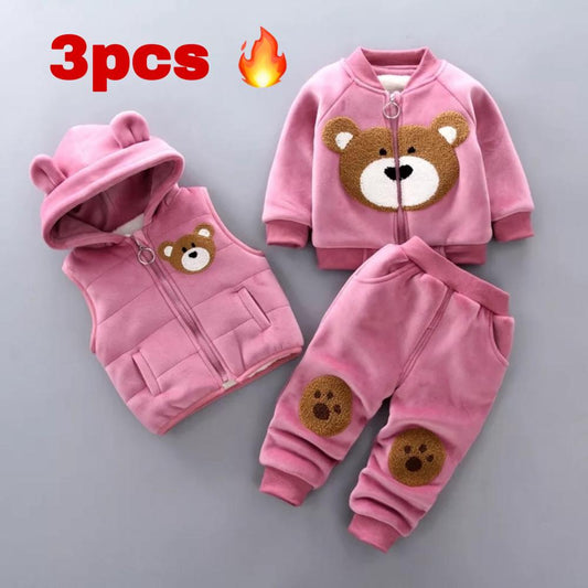 • Baby boy's clothes cotton warm suit Bear cartoon printing plus velvet padded sweater baby girl's clothes hooded vest three-piece