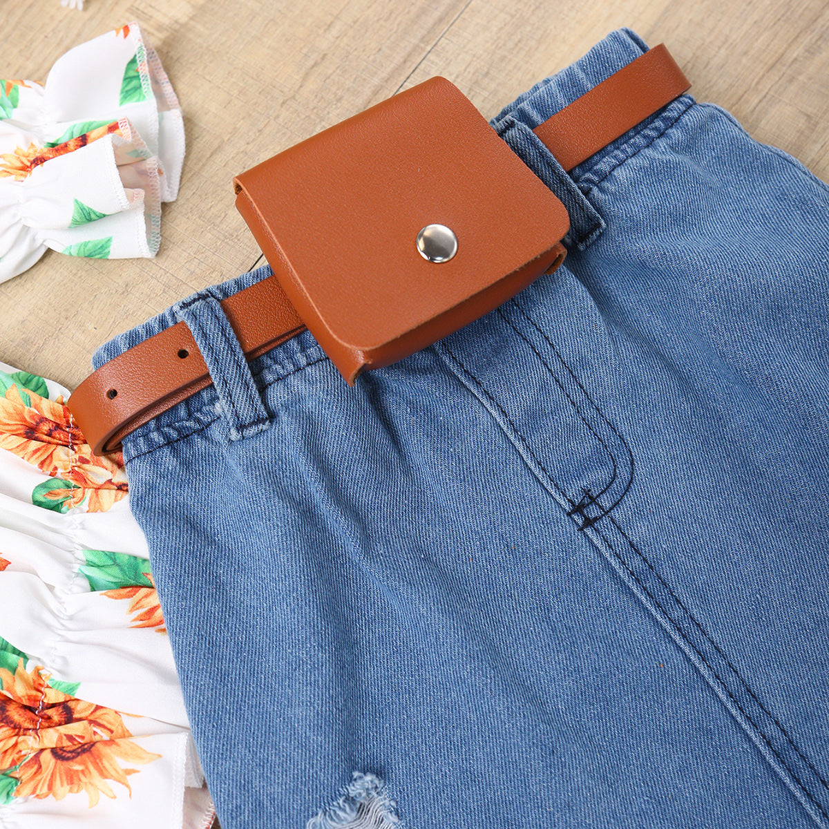 Girls New Korean Version Of Long Sleeve Sunflower Flared Top + Solid Color Suspender Skirt Two-Piece Set