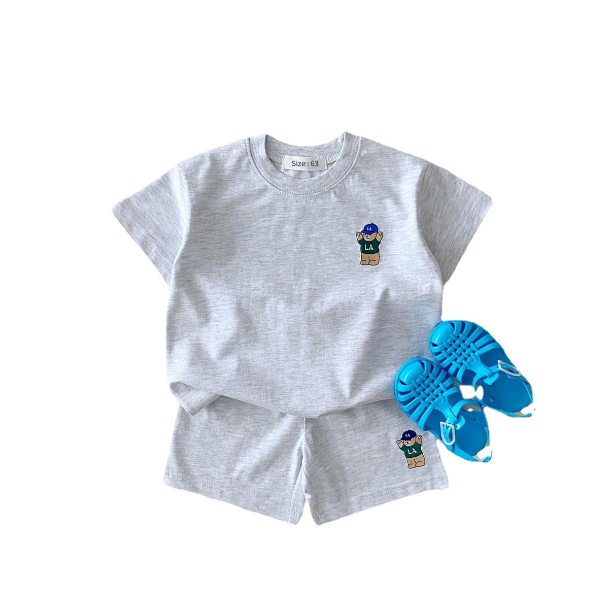 Korean Version Of Ins Children's Clothing Candy Color Cotton Casual Short-Sleeved Suit Baby Cartoon Bear T-Shirt Shorts