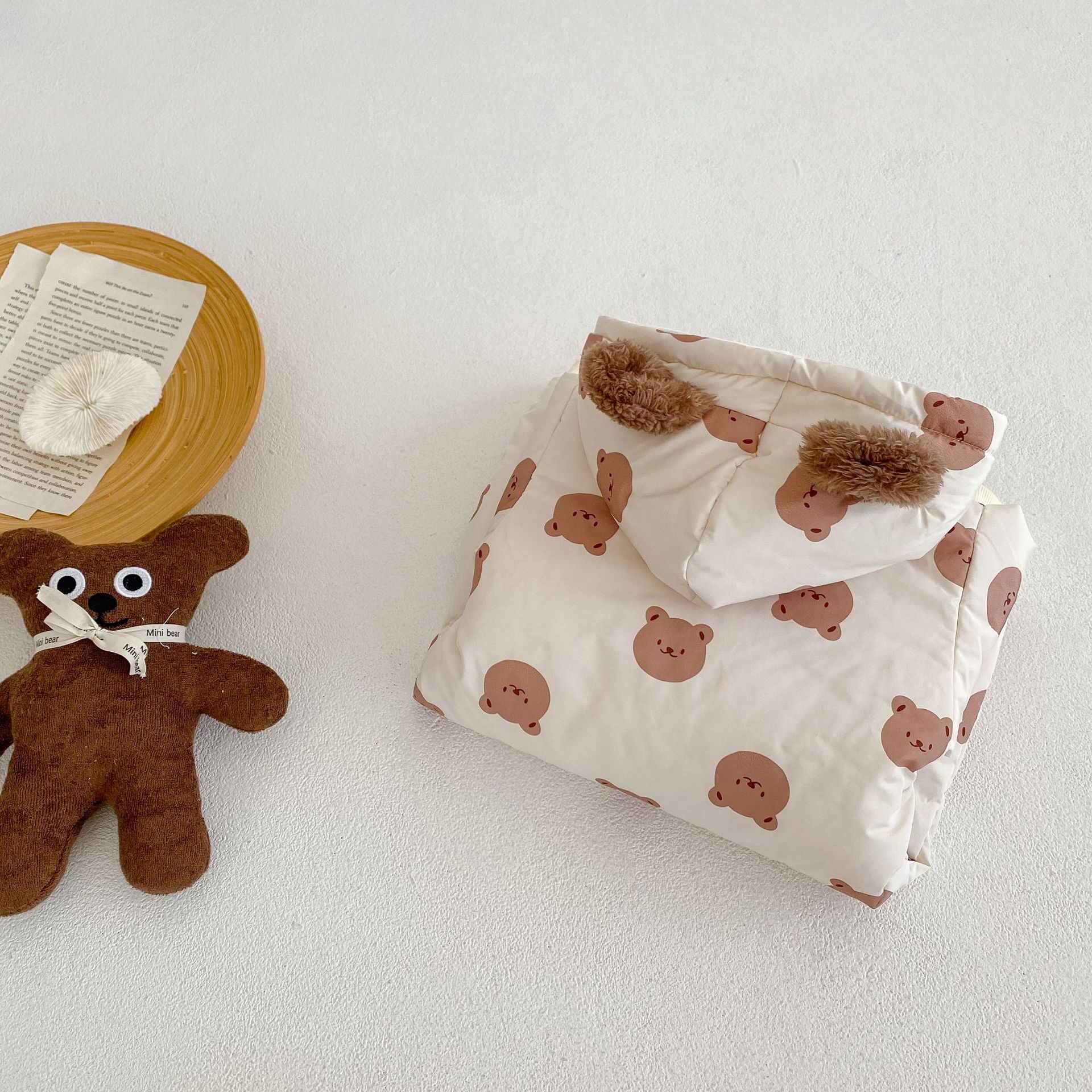 Winter Fleece Warm Bear Print Hooded Long Creeping Cotton Bodysuit Infant and Toddler Boys and Girls Long Creeping Clothes
